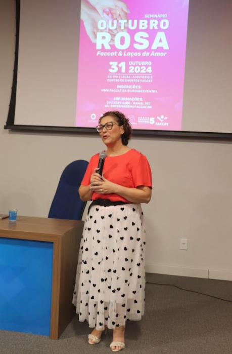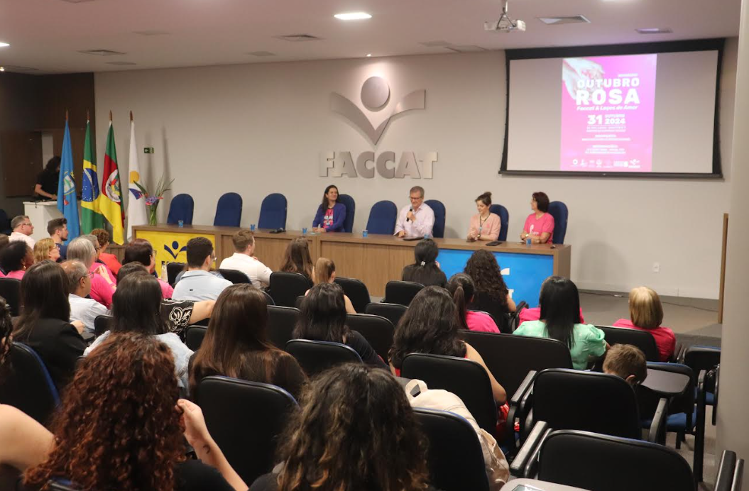 Na noite de 31 de outubro, o Seminário Integrado do Outubro Rosa reuniu mais de 200 participantes, batendo recorde de público. A ação, realizada no Auditório 3 do Centro de Eventos da Faccat, foi promovida em parceria com o grupo Laços de Amor e com os cursos de Enfermagem, Psicologia e Fisioterapia. O seu objetivo foi destacar a importância da conscientização e prevenção do câncer de mama, reconhecido internacionalmente no mês de outubro.