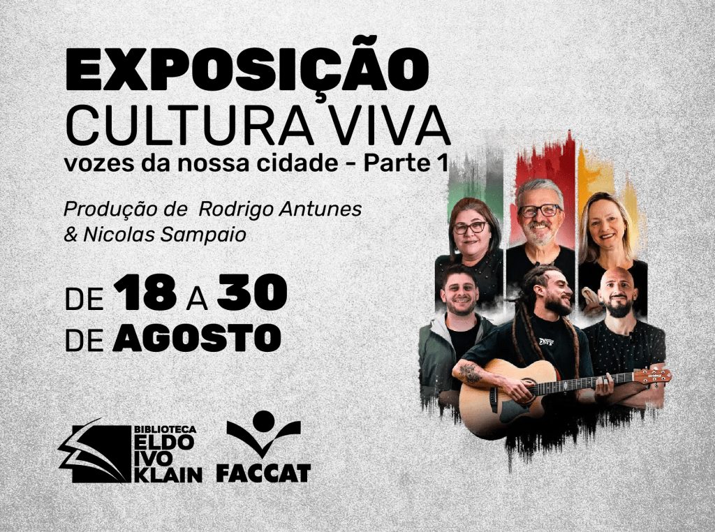 A Biblioteca Eldo Ivo Klain, das Faculdades Integradas de Taquara (Faccat), será palco da exposição “Cultura Viva: vozes da nossa cidade – Parte 1”. Realizada entre os dias 18 e 30 de agosto, a ação tem entrada solidária, com a doação de um (1) quilo de alimento não perecível, que será destinado ao Lar Padilha, de Taquara. A abertura oficial ocorre no dia 18 de agosto, às 20h, com uma conversa especial com o produtor cultural Rodrigo Antunes.