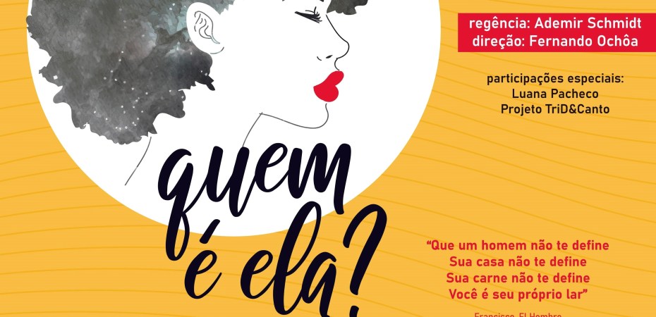 O espetáculo “Quem é ela?” aborda o universo feminino por meio das diferentes manifestações poéticas que colocam a mulher na dinâmica da reflexão e ação social. A orquestra de sopros, que completou 25 anos de atividades, conta com 27 instrumentistas, a solista Luana Pacheco, sob a regência de Ademir Schmidt e direção de espetáculo de Fernando Ochôa. Todos os concertos da Eintracht são com entrada.