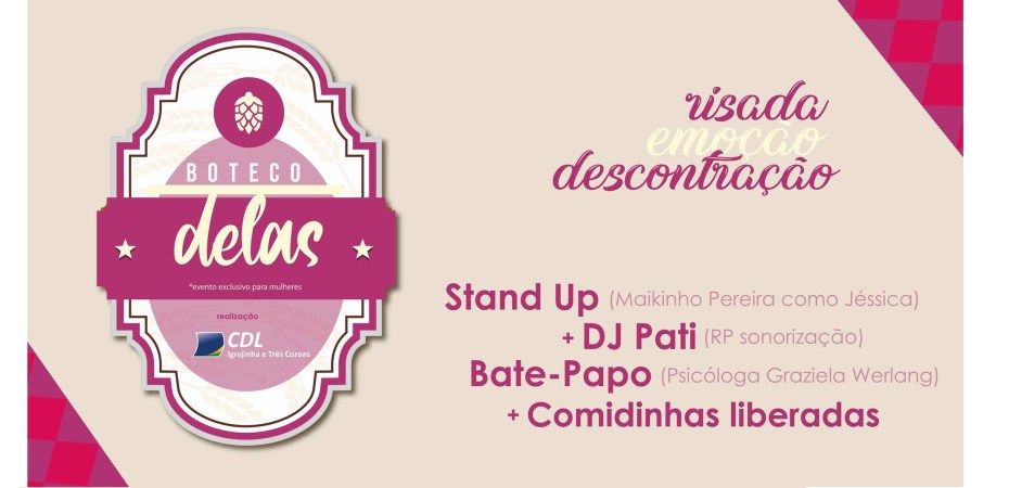 Para marcar o mês dedicado às mulheres, o CDL de Igrejinha e Três Coroas promove o “Boteco Delas”. Com uma noite dedicada ao autoconhecimento, diversão e confraternização, o evento acontece no dia 31 de março (terça-feira), às 19h30, na Sociedade 12 de Janeiro, em Três Coroas.