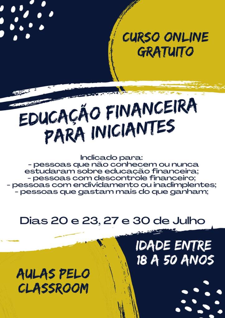 Do ABC da Educação Financeira e a importância dela na vida das pessoas, às soluções para sair de dívidas e conseguir ter uma reserva financeira, o curso vai ajudar no relacionamento com o dinheiro. As aulas serão realizadas pelo Classroom, onde serão apresentados conceitos, promovidas atividades e os alunos poderão tirar dúvidas. As vagas são limitadas e é disponibilizada certificação para os que concluírem as atividades. Inscrições no link: forms.gle/NWv4Gtbg3Xh5ueni7.