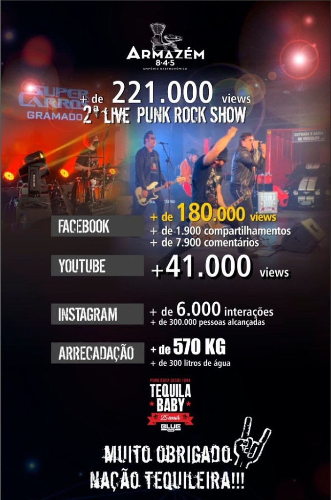 Em uma live histórica em comemoração ao Dia Mundial do Rock (13 de julho), a banda Tequila Baby conseguiu, além de apresentar um grande espetáculo ao público, arrecadar 570 quilos de alimentos e 300 litros de água. O projeto Cozinheiros do Bem, de Porto Alegre, e a APAE de São Francisco de Paula vão ser os grandes beneficiados com esse gesto de solidariedade.