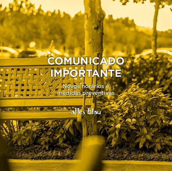 Assim, levantando a bandeira da responsabilidade social, que é um dos maiores e mais importantes valores que o Alles Blau Shopping a Céu Aberto tem com seus clientes e visitantes, em nota foi informado que: “Em um momento crítico de pandemia, onde a ação individual de proteção precisa estar em destaque e percebendo que algumas pessoas ainda não entenderam a verdadeira importância de se protegerem e, principalmente, proteger aqueles que amam, novas medidas de segurança serão acrescentadas às medidas preventivas que já estavam sendo obedecidas”.