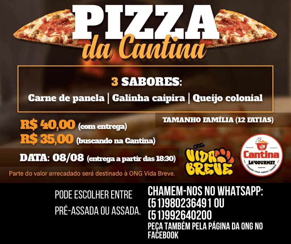A pizza é Tamanho Família (12 fatias), divida em três sabores padrão: carne de panela, galinha caipira e queijo colonial. É possível escolher entre pré-assada ou assada. Os cartões já estão à venda no valor de R$ 35,00 para retirada no local e R$ 40,00 com entrega em Taquara. Os pedidos podem ser feitos via WhatsApp (51 98023.6491 ou 51 99264.0200) ou no Messenger da ONG Vida Breve.