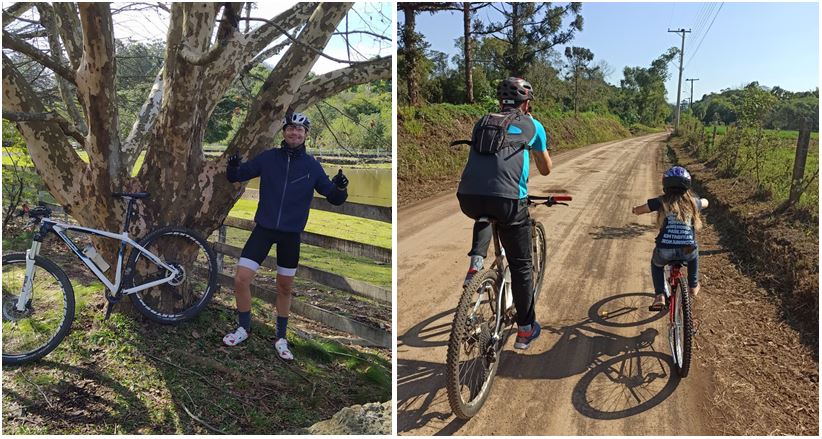 “A bicicleta é quase uma extensão do corpo, um estilo de vida”, declara o fisioterapeuta Charles Kinast. Ele pedala desde criança, chegando a competir entre 2010/2014 em várias modalidades de bicicleta, ciclismo de estrada e Mountain Bike. “Esse momento me fez conhecer muitas pessoas legais que contribuíram com o meu crescimento. Devido a faculdade, tive que abandonar as corridas e ficar somente com a parte recreativa da bicicleta. Hoje a bike representa as amizades, a família que também está inserida nessa ‘vibe’, minha esposa Ana Cristina curte muito e pedala também, sempre com a Clara, nossa filha de 6 anos”, comemora a vivência e a integração familiar com o esporte que tanto ama.
