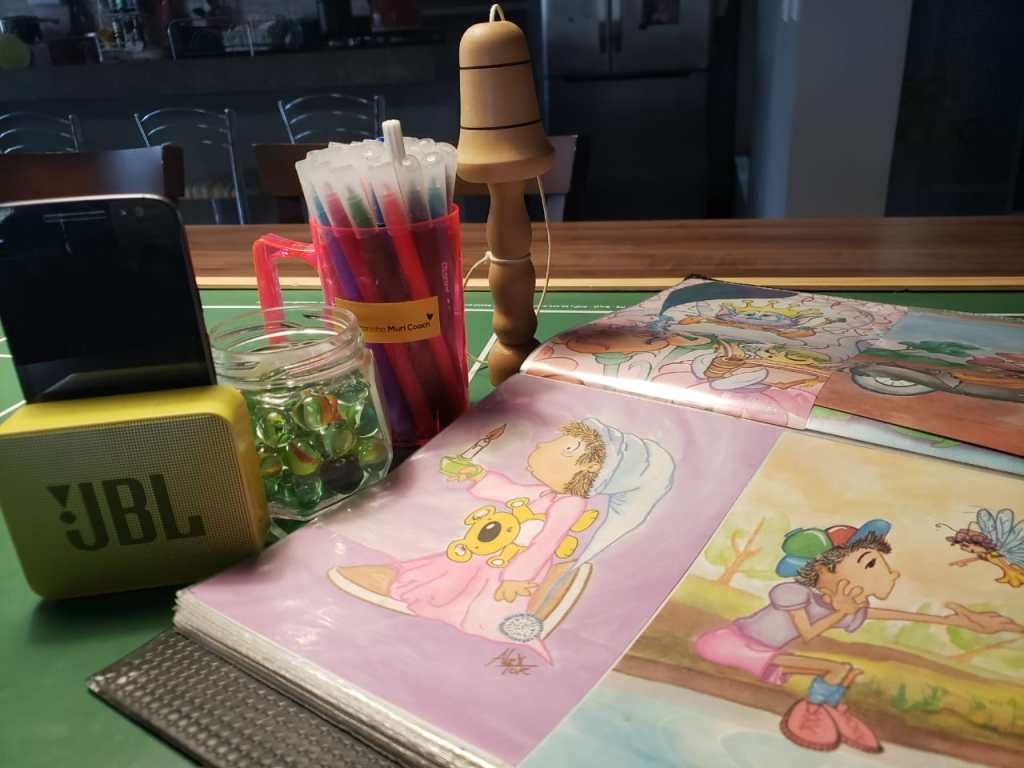 Nesta foto aqui trago materiais que vemos a todo momento como o celular, a caixinha de som, canetinhas coloridas e alguns guardados por 30, 40 anos como papéis de carta, bilboquê, botões de futebol de mesa do Ju (meu marido).