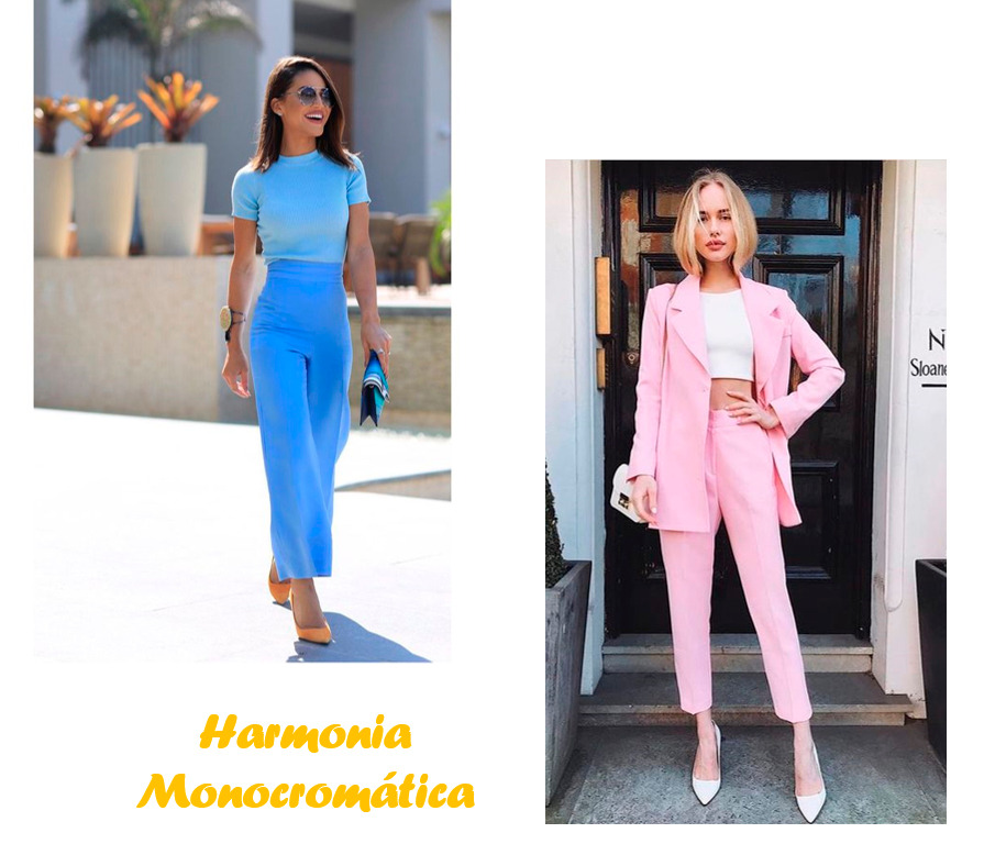 Essa harmonia comunica bastante elegância. Consiste em usar peças de uma mesma cor, podendo ser em tons diferentes. Uma dica para essa combinação é apostar em roupas com tecidos de texturas diferentes, para o look não ficar tão monótono. Looks monocromáticos tendem a alongar a silhueta, além de serem sempre muito elegantes.