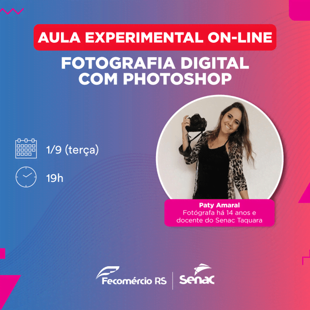 A fotografia e, principalmente, a sua edição, demandam tempo e conhecimento de técnicas específicas. Para os interessados no assunto, o Senac Taquara realizará uma aula experimental on-line e gratuita do curso de Fotografia Digital com Photoshop. A aula acontece no dia 1º de setembro, às 19h e abordará a fotografia digital, o photoshop, fotografia espontânea, importância de equipamentos e muito mais.