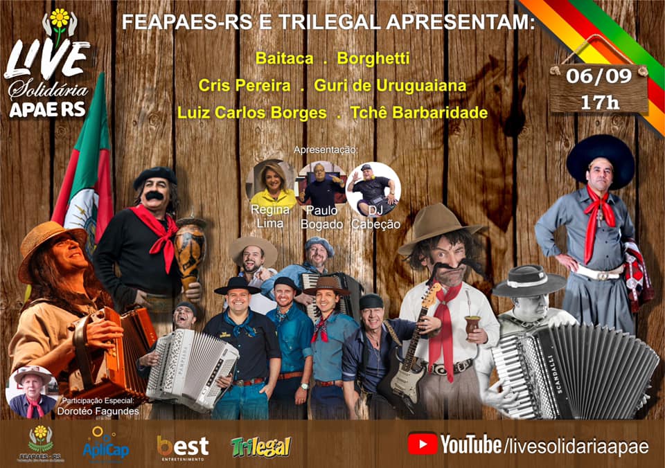 Em uma super live transmitida diretamente do Poa Drive-in Show, o público poderá se divertir com os maiores nomes da cultura gaúcha que se apresentarão ao vivo: Baitaca, Tchê Barbaridade, Luiz Carlos Borges, Renato Borghetti, Gaudêncio, Guri de Uruguaiana, além da participação mais do que especial de Dorotéo Fagundes. A apresentação ficará por conta de Regina Lima, Paulo Bogado e DJ Kbção. A transmissão acontecerá pelo Youtube Live Solidária Apae.