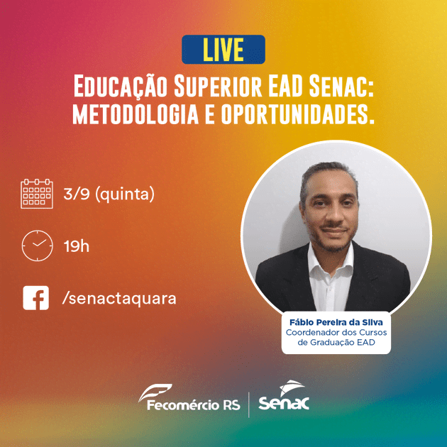 Para quem deseja estar preparado para a retomada pós-pandemia e quer saber como escolher uma graduação a distância de qualidade, o Senac Taquara promove a live “Conheça a Educação Superior EAD do Senac: metodologia e oportunidades”. A atividade será no dia 03 de setembro, a partir das 19h, no Facebook da escola, e será conduzida pelo coordenador dos cursos de graduação EAD do Senac (com uma rede de 330 polos no Brasil), Fábio Pereira da Silva.