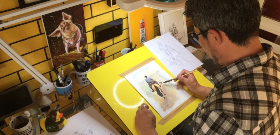 Para ele, a adaptabilidade ao pedido do cliente e a habilidade de conseguir traduzir em desenhos estes pedidos estão entre seus diferenciais. “Eu faço um trabalho muito racional. Não gosto de impor a minha arte, o meu estilo. Não consigo ser excêntrico e por isso me adapto bem ao que preciso criar”, conta. Ele estuda e aprimora suas técnicas para conseguir atender às demandas e foi assim também que passou a desenhar ao vivo em programas de televisão e eventos para além das linhas do RS e do Brasil. “Fui fazer um teste em SP para ingressar no line up dos eventos. Eu tinha 20 minutos para pintar em uma tela de 60×80. Escolhi fazer um retrato de Edgar Allan Poe, um de seus corvos e uma parte de um de seus poemas. Quando terminei, os julgadores começaram a rir. Eu tinha feito algo considerado bem difícil em 17 minutos”, relembra. E a partir daí muitas portas foram se abrindo em eventos, inclusive com grandes nomes da música e do futebol.
