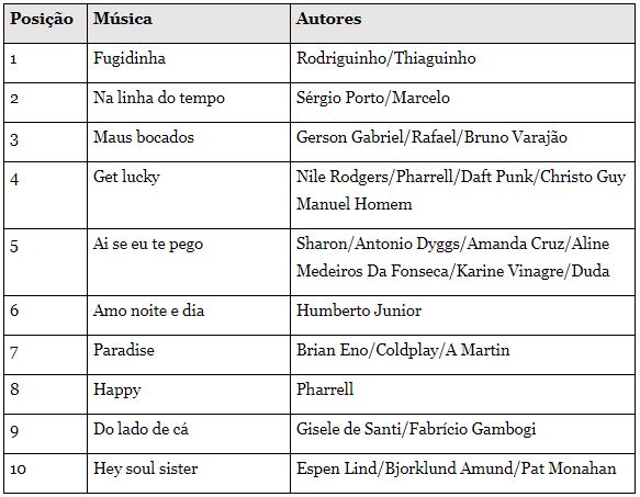 A música mais tocada no país em rádios nos últimos 10 anos foi “I want to know what love is“, de autoria de Mick Jones. No top 5 desse ranking as músicas internacionais prevalecem e, entre as primeiras, estão “Paradise”, “Happy”, “Set fire to the rain” e “Get lucky”.