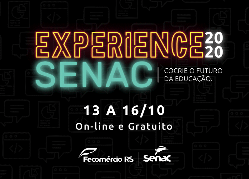 Diálogos com profissionais da educação e tecnologia do Brasil e do mundo marcarão a edição on-line e gratuita do Experience Senac 2020. O evento acontecerá entre os dias 13 e 16 de outubro, 100% ao vivo no canal do Youtube do Senac-RS.