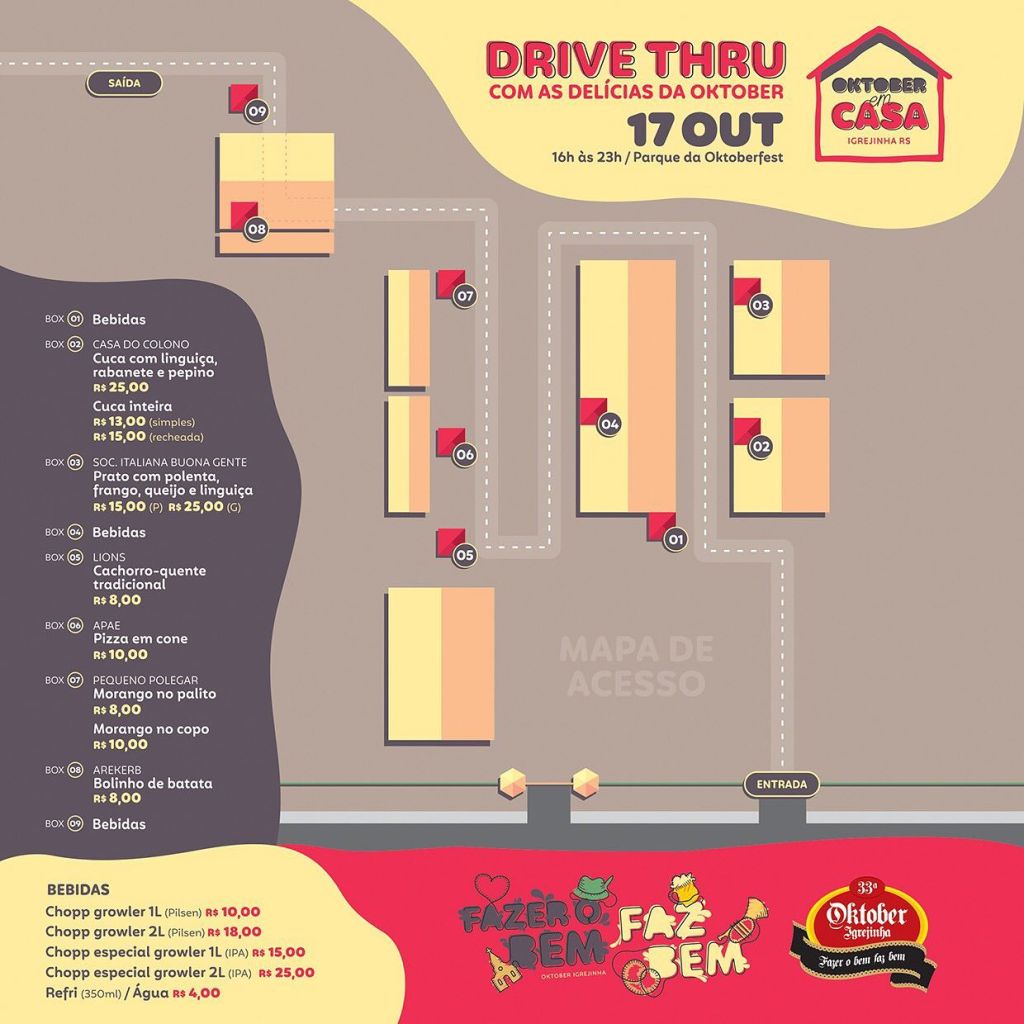 As delícias gastronômicas e a música que embala milhares de visitantes e voluntários a cada mês de outubro, em Igrejinha, estarão presentes no próximo sábado, 17, no Parque da Oktoberfest, com a edição do “Oktober em Casa“. A ação promete relembrar e marcar 2020 nas comemorações da 33ª Oktoberfest de Igrejinha, que precisou ser remarcada por conta da pandemia do novo Coronavírus. A programação contará com um drive thru para comercialização dos lanches e bebidas característicos da festa e live com as bandas Choppão e Brilha Som, através das redes sociais da oktober.