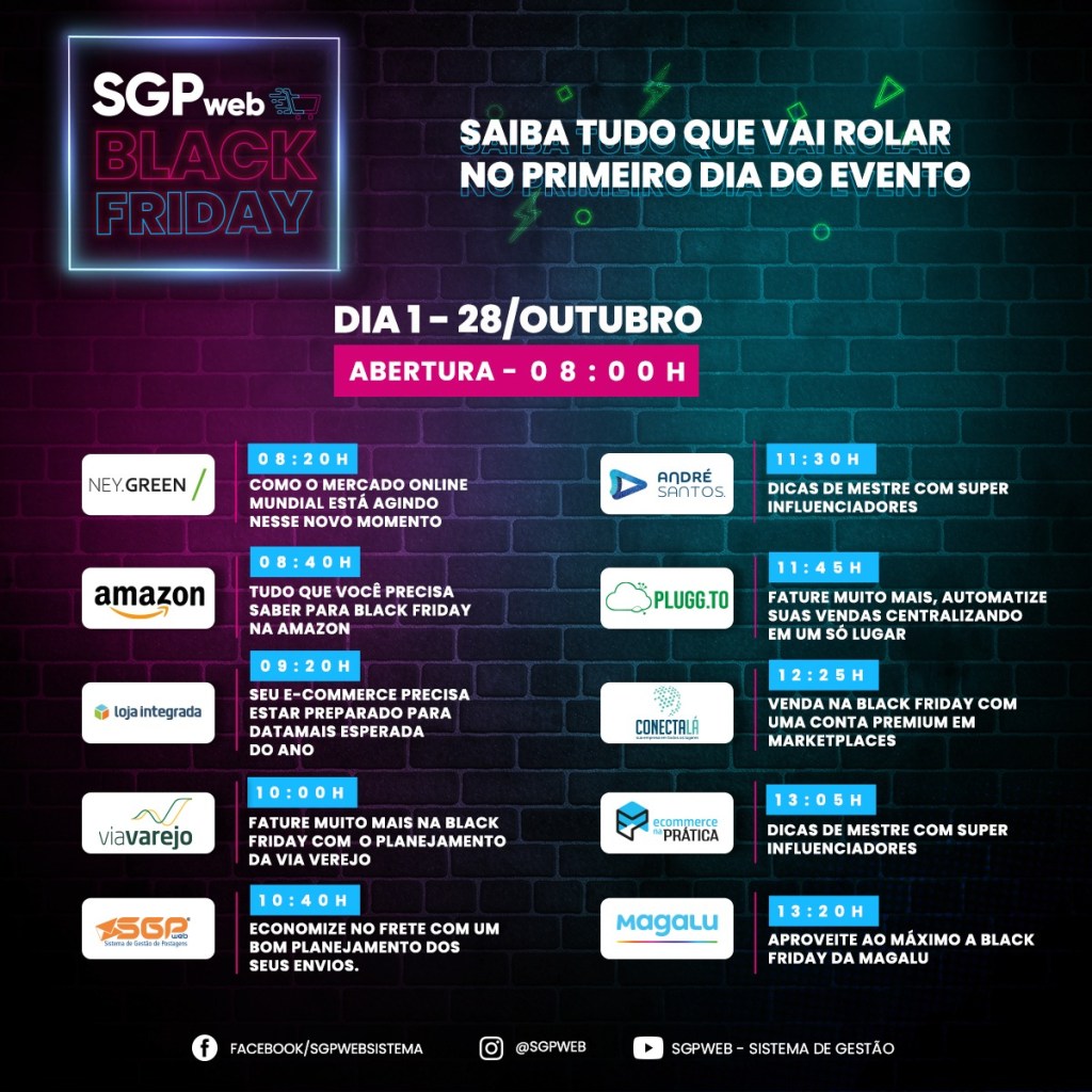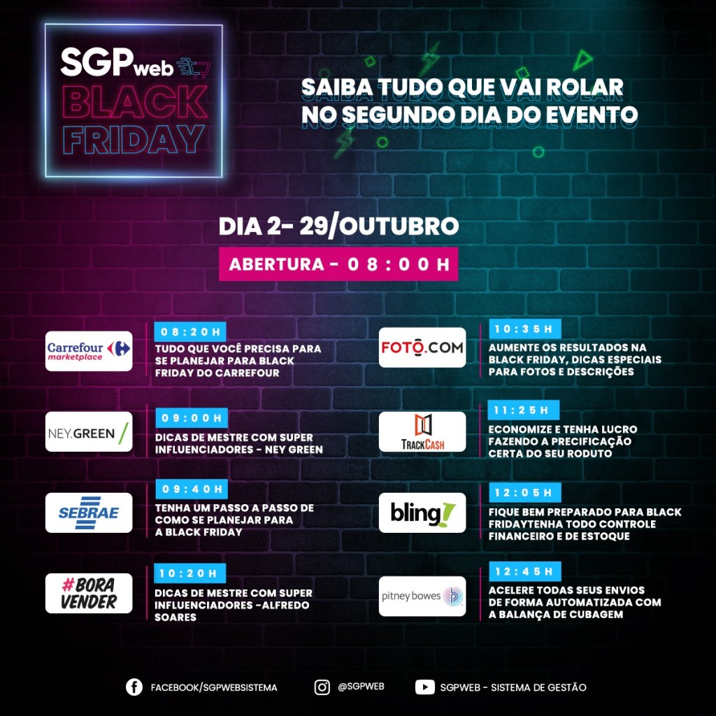 No dia 27 de novembro acontece a ação de vendas mundial Black Friday 2020, que chega à sua décima edição no Brasil. Com o objetivo de oferecer conteúdo exclusivo e direcionado para lojistas que estão se preparando para a data, nos dias 28 e 29 de outubro acontece a SGPweb Black Friday. Com mais de 12 horas de conteúdo gratuito, o evento oferecerá conhecimento prático e direto para que os lojistas estejam prontos para atender essa demanda de compras.