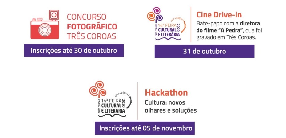 A comunidade três-coroense poderá escolher e acompanhar diferentes atividades culturais durante os meses de outubro e novembro. A 14ª edição da Feira Cultural e Literária de Três Coroas está com a programação recheada para atender todos os públicos e as ações programadas reúnem um concurso fotográfico, um cine drive-in e um inédito hackathon. Neste ano o evento conta com edições nos formatos on-line e presencial, com a última programada para os dias 8 a 13 de dezembro.