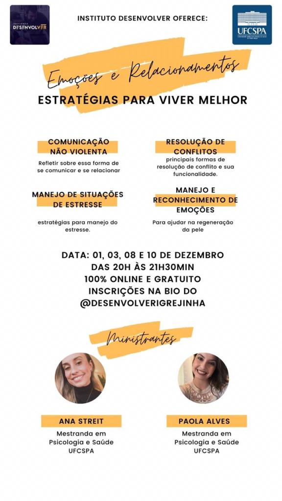 O Instituto Desenvolver, de Igrejinha, está com inscrições abertas para mais um curso on-line e gratuito, agora na área de desenvolvimento pessoal. Com o nome “Emoções e Relacionamentos: Estratégias para Viver Melhor”, as aulas serão ministradas pelas psicólogas Ana Streit e Paola Alves, com a coordenação de Flávia Lemes Matte. Serão abordados os temas: Comunicação não violenta; Resolução de conflitos; Manejo de situações de estresse; e Manejo e Reconhecimento de emoções.
