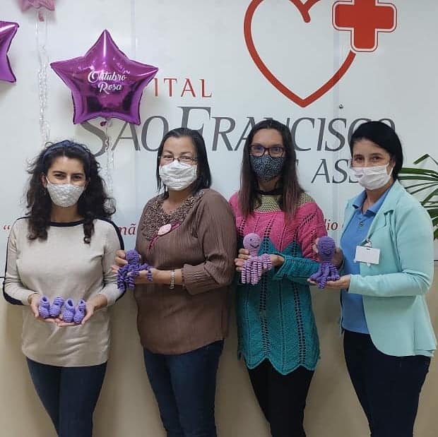 Como ação do Novembro Roxo, mês que debate a prematuridade, quatro voluntárias fizeram a doação de 60 polvinhos de crochê para presentear os bebês prematuros nascidos no Hospital São Francisco de Assis – HSFA, de Parobé. Entre os benefícios do brinquedo, está o conforto e segurança que oferece aos pequenos. As voluntárias preparam uma nova remessa de polvinhos para o mês de dezembro.