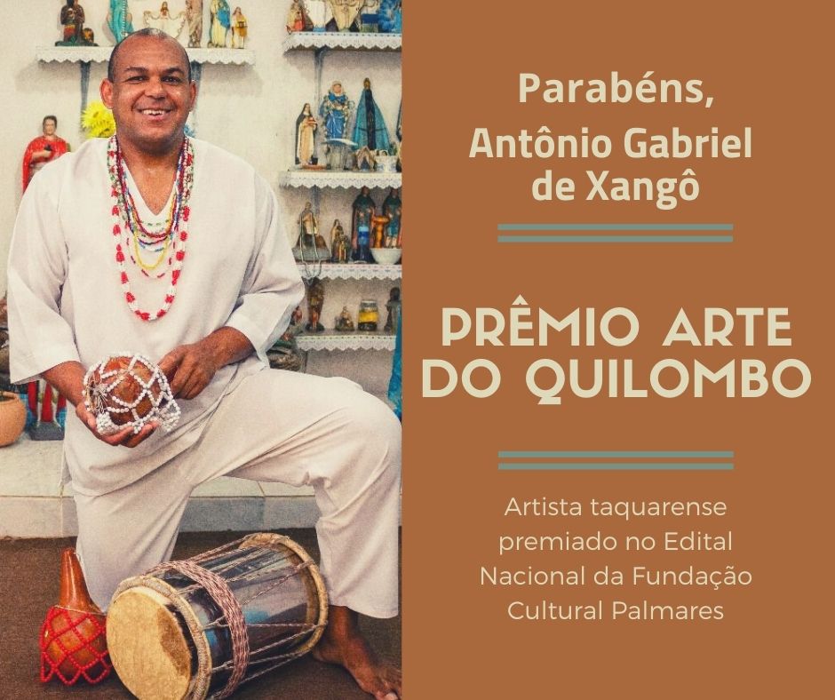 Na última segunda-feira, 21 de dezembro, a Fundação Cultural Palmares divulgou no Diário Oficial da União a lista dos premiados do Edital Arte do Quilombo. Nesta lista, destaca-se o artista taquarense Antônio Gabriel de Xangô – conhecido também como Biel, que foi contemplado com a premiação na categoria Música.