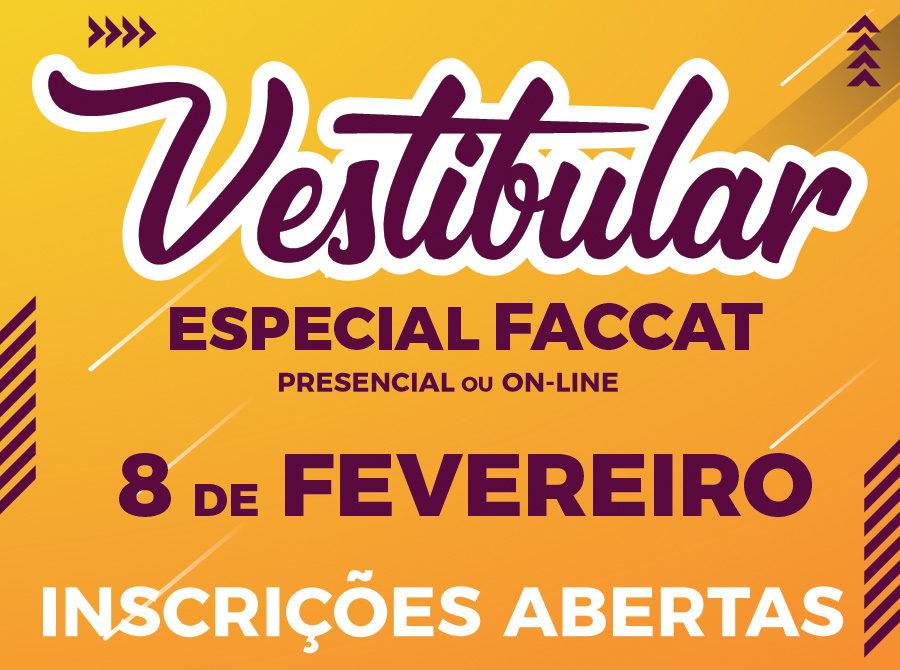 As inscrições para o Vestibular Especial Faccat 2021, que acontecerá no dia 08 de fevereiro, já estão abertas. Para realizar a prova, o candidato poderá optar pela modalidade presencial ou on-line e escolher o melhor horário: 14h, 18h ou 20h. Todas as opções serão compostas por uma prova de Redação. Além do Vestibular, o interessado também poderá ingressar na Faccat utilizando a sua nota de Redação do Enem. As inscrições são gratuitas e seguem até 07 de fevereiro.