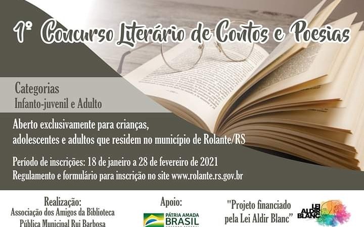 Com o objetivo de incentivar e valorizar a produção literária, a Associação dos Amigos da Biblioteca Pública Municipal Rui Barbosa, em Rolante, promoverá o 1º Concurso Literário de Contos e Poesias. O projeto é financiado pela Lei Aldir Blanc, com recursos do Governo Federal, através do Departamento Municipal de Cultura.