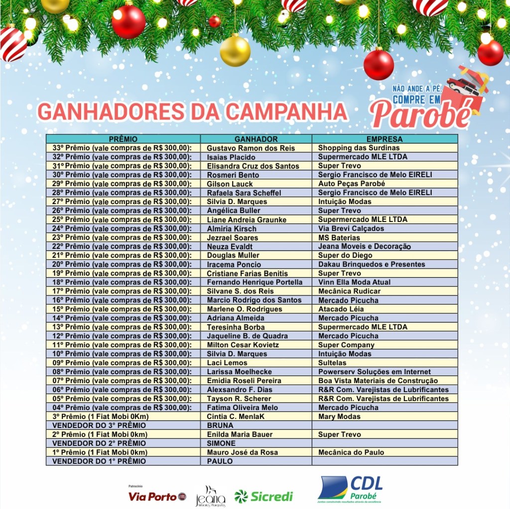 Ao todo, a promoção contou com a participação de 176 empresas que, juntas, ajudaram a distribuir em torno de 1,6 milhão de cupons aos consumidores da região. Diante disso, mais uma vez a iniciativa conseguiu superar as expectativas da organização. “Trabalhamos muito para que a campanha fosse realizada num formato ainda maior, pois neste ano ela foi concebida pensando no futuro do nosso comércio diante de todos os problemas que passamos devido à pandemia”, destacou o ex-presidente da entidade, Jones Vendruscolo. Em sua fala, ele também enfatizou o apoio dos comerciantes e prestadores de serviço, dos patrocinadores – Via Porto, Jeana Móveis e Decoração e Sicredi -, da Prefeitura e da Câmara de Vereadores de Parobé. “Este aporte feito pelo Poder Público na campanha é muito importante, pois os 1,6 milhão de cupons acabam revertidos em valores de ICMS e, assim, retornam em investimentos para o nosso município”, contextualizou Vendruscolo.