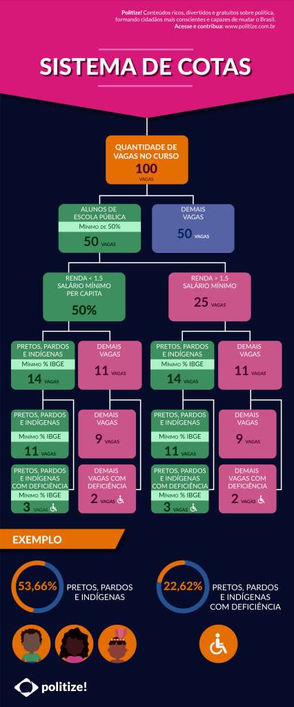 A Lei de Cotas (nº 12.711/2012) estabelece que todas as instituições federais de ensino superior e de ensino técnico em nível médio devem destinar 50% das vagas por curso e turno a estudantes oriundos integralmente do ensino médio público. Destas vagas, a metade é destinada a alunos de famílias com renda per capita de até 1,5 salário mínimo.