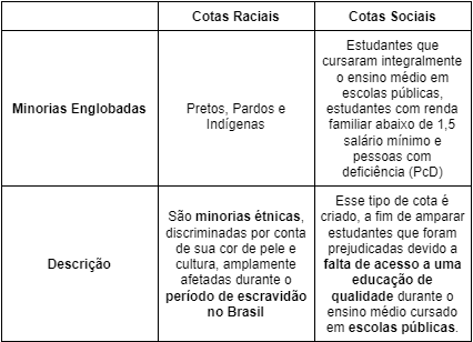 Ambos os modelos de cotas, raciais e sociais, são ações afirmativas1 que objetivam o combate às desigualdades de raça e renda no acesso ao ensino superior, a fim de diminuir as diferenças sociais, econômicas e educacionais entre etnias e grupos minoritários. Vejamos o quadro abaixo, criado pelo Politize! , para esclarecer as diferenças conceituais entre os esses tipos de cotas: