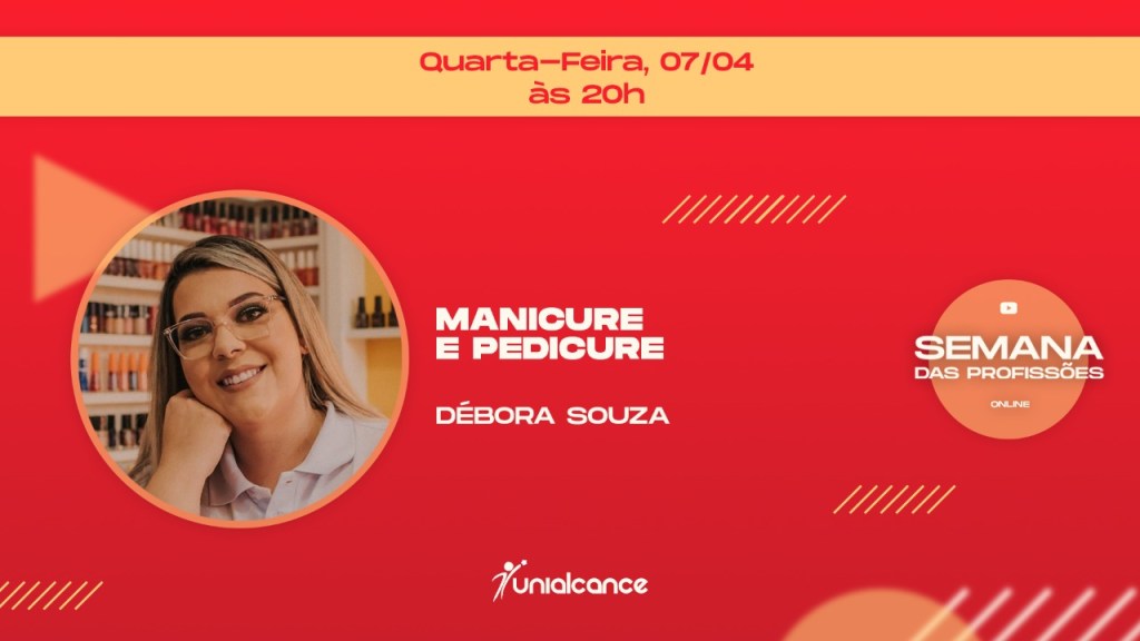 07.04 (quarta-feira): Débora Cristina de Souza de Oliveira: Empreendedora e Nail Designer. Formação técnica em contabilidade e especialista em embelezamento de unhas com experiência de mais de 10 anos neste mercado. Possui sólidos conhecimentos obtidos através de formações profissionais em: manicure e pedicure, alongamentos de unhas em acrílico, fibra de vidro e gel moldado. Recentemente participou de um curso de aperfeiçoamento com a Barbie das Unhas, além de treinamentos específicos de Decoração 3D e Polygel Skills.