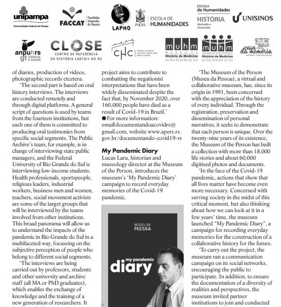 O periódico Oral History Journal, do Reino Unido, publicou em sua edição de abril uma reportagem a respeito dos trabalhos e pesquisas sobre a pandemia do Coronavírus pelo mundo. Entre os destaques, está o projeto “Documentando a experiência do COVID-19 no Rio Grande do Sul”, organizado pelo Arquivo Público do Rio Grande do Sul (APERS) e que conta com a realização das Faculdades Integradas de Taquara (Faccat), além de outras universidades do Estado.