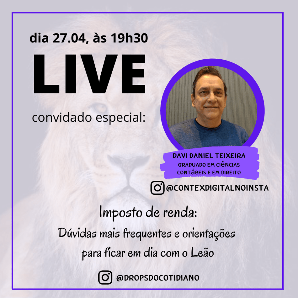 É tempo de fazer a Declaração do Imposto de Renda de Pessoa Física. O tema sempre gera dúvidas e se não for realizada de forma adequada pode gerar problemas para o contribuinte com a receita federal. Por isso, o assunto entra em pauta na #livedodrops, que tem como convidado Davi Daniel Teixeira, diretor da Contex Brasil e sócio da Contex Digital, com sede em Parobé. O bate-papo “Imposto de Renda: dúvidas mais frequentes e orientações para ficar em dia com o Leão” terá transmissão nesta terça-feira, 27, às 19h30, no Instagram @dropsdocotidiano. O objetivo da live é responder as principais dúvidas, falar sobre os erros mais comuns e contribuir com orientações para garantir a declaração de forma correta.
