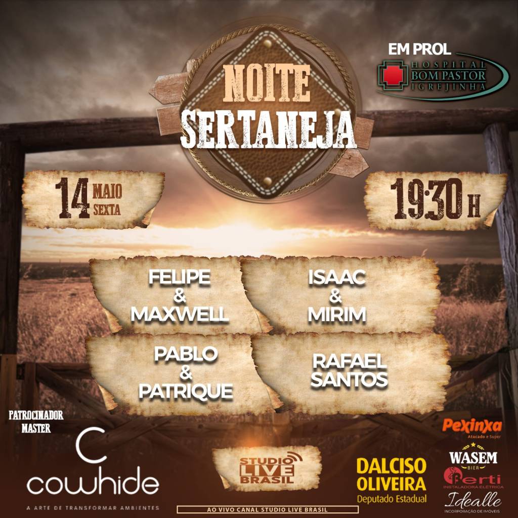 Música e solidariedade são aquele combo que sempre vai bem. Nessa sexta, 14/05, a live Noite Sertaneja vai reunir artistas do estilo em uma ação em prol do Hospital Bom Pastor. A transmissão será pelo Canal do YouTube da Studio Live Brasil, produtora de eventos responsável pela realização da live, a partir das 19h30.