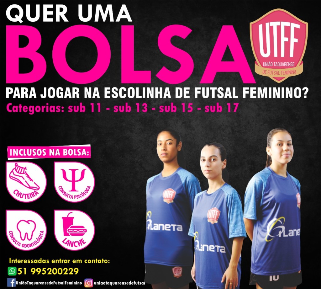 Na busca por proporcionar a meninas taquarenses, entre 10 a 17 anos, oportunidades na área do esporte, para a modalidade de futebol de salão, a União Taquarense de Futsal Feminino (UTFF) está ampliando o seu trabalho com a comunidade. Através de um novo projeto, será ofertado bolsas a estudantes da rede municipal de ensino de Taquara que não tenham condições financeiras de usufruir da iniciativa.