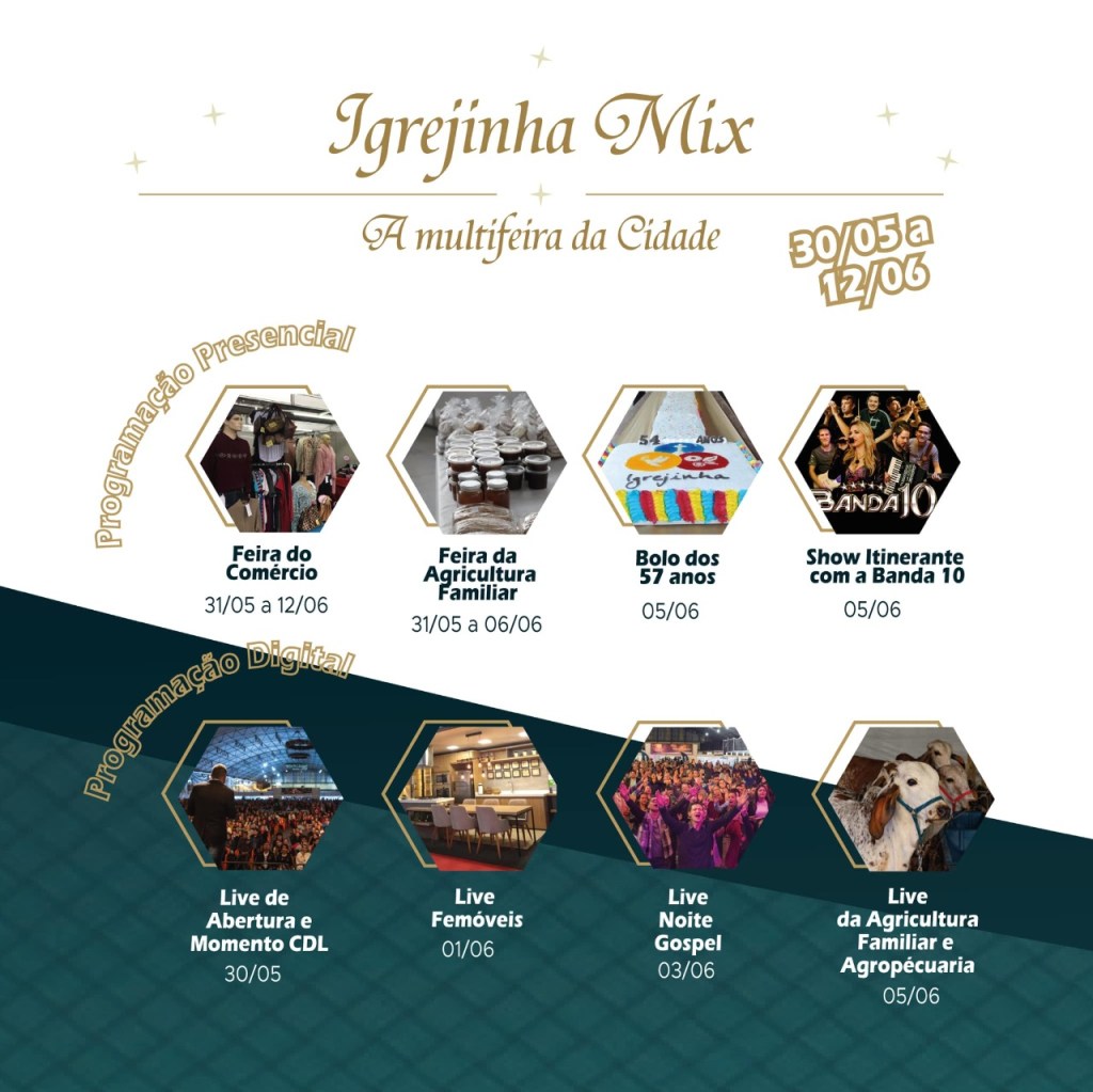 O tradicional evento de aniversário de Igrejinha, em 2021, acontecerá em novo formato, mantendo o objetivo de valorizar e presentear a comunidade nas mais variadas áreas. O Igrejinha Mix acontecerá em formato hibrido, ou seja, terá parte de sua programação no ambiente virtual (com transmissão de programas temáticos ao vivo pela internet) e presencial descentralizado (cumprindo os protocolos sanitários vigentes).