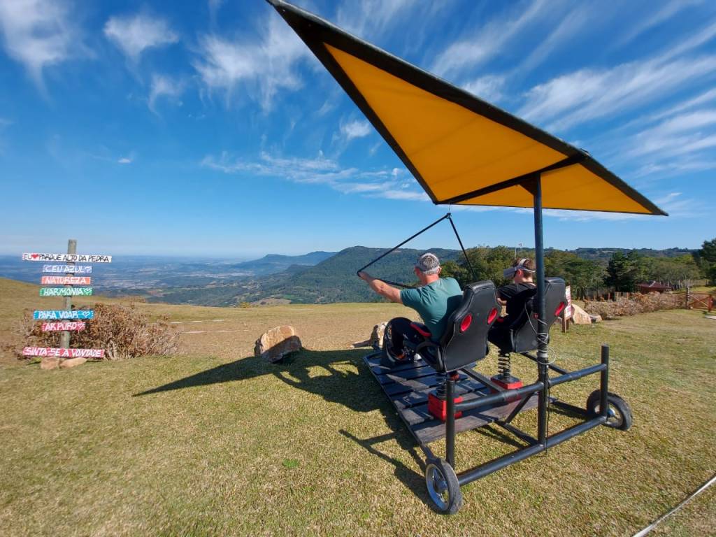 Já pensou em voar de asa delta sem sair do chão? Essa é a proposta do simulador de voo em realidade virtual do Parque Alto da Pedra, em Igrejinha. A novidade foi instalada no último sábado, 31 de julho, e já está fazendo sucesso com o público. O equipamento, que já esteve em eventos e locais turísticos, agora chega para agregar aos visitantes, oportunizando mais uma experiência para quem vai ao local. A iniciativa é do piloto James Kehl, responsável por fazer os voos duplos asa delta, que buscou informações sobre este equipamento e conseguiu trazê-lo para o parque igrejinhense.