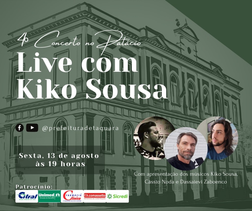 A Prefeitura de Taquara realiza na próxima sexta-feira, 13 de agosto, o 4º Concerto no Palácio, com a apresentação do artista local Kiko Sousa. Solidária, a live será realizada no Palácio Coronel Diniz Martins Rangel, sede da Administração Municipal, e terá transmissão ao vivo pelo Facebook e no YouTube da Prefeitura.