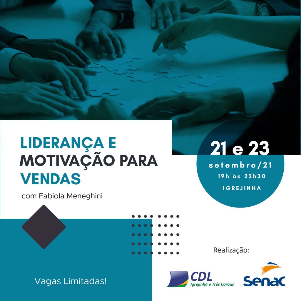 O curso de Liderança e Motivação para as Vendas será realizado nos dias 21 e 23 de setembro, das 19h às 22h30, na sede da CDL em Igrejinha (Rua da Independência, (Rua Independência, 102, no Centro). As vagas são limitadas e há desconto para associados da entidade. Mais informações podem ser obtidas pelo telefone/WhatsApp 51 98414-0951 ou pelo email comercial@cdligretc.com.br.