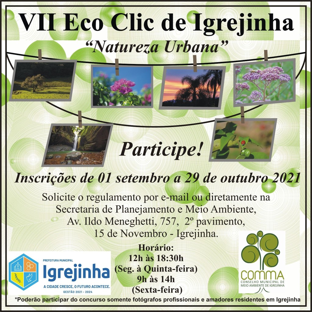 O concurso fotográfico VII Eco Clic de Igrejinha deste ano tem como tema “Natureza Urbana” e busca evidenciar as belezas existente em seu território. A competição é aberta a todos os fotógrafos – profissionais ou amadores – que sejam residentes e domiciliados em Igrejinha.