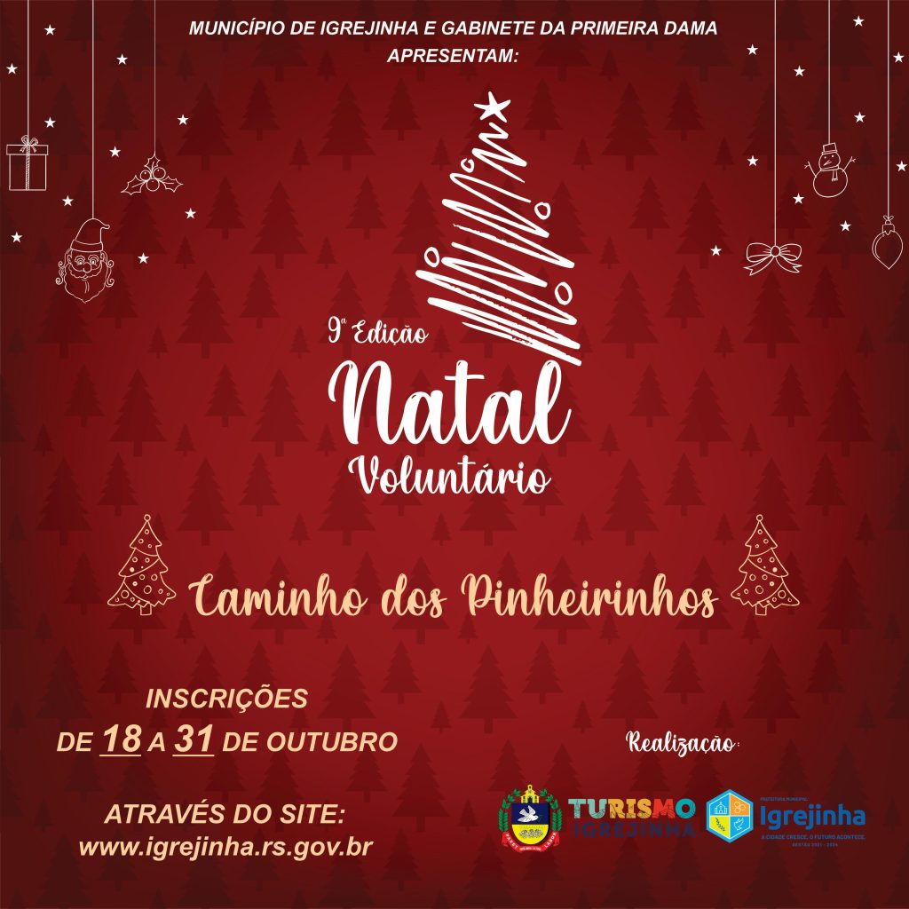 Igrejinha deve, mais uma vez, ficar colorida e iluminada com o “Caminho dos Pinheirinhos” do seu 9º Natal Voluntário. Abriu nesta segunda-feira, 8, a inscrição para empresas e entidades que desejem decorar um pinheirinho durante a ação. Promovido anualmente pelo Município de Igrejinha, através do Gabinete da Primeira-Dama e da Secretaria de Turismo e Cultura, a ação busca promover a decoração natalina de 270 pinheiros expostos ao longo das Avenidas Presidente Castelo Branco, Ildo Meneghetti e Herbert Evald Müller, bem como na rótula da árvore da Figueira, no bairro Figueira.