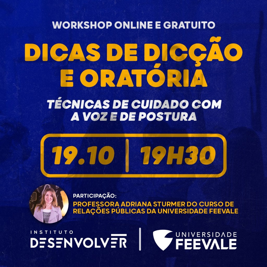 Se comunicar melhor, diminuir o medo de falar em público e melhorar sua dicção, oratória e postura é cada vez mais necessário. Quem deseja se desenvolver nesta área tem uma ótima oportunidade na terça-feira, 19. O Workshop “Dicas de dicção e oratória, técnicas de cuidado com a voz e de postura“, promovido pelo Instituto Desenvolver em parceria com a Universidade Feevale, será às 19h30 e vai trazer o assunto em destaque com dicas certeiras da especialista no assunto Adriana Sturmer. “Conseguir se expressar melhor, controlar o nervosismo e despertar a habilidade de falar em público é um diferencial no mercado de trabalho e na vida. Por isso estamos ofertando este workshop onde contaremos com as dicas de uma profissional com ampla experiência na área da comunicação e em docência, que é apaixonada por desenvolver pessoas em sua comunicação pessoa”, declara a coordenadora do Eixo de Comunicação do Instituto Desenvolver, jornalista Lidiani Lehnen.