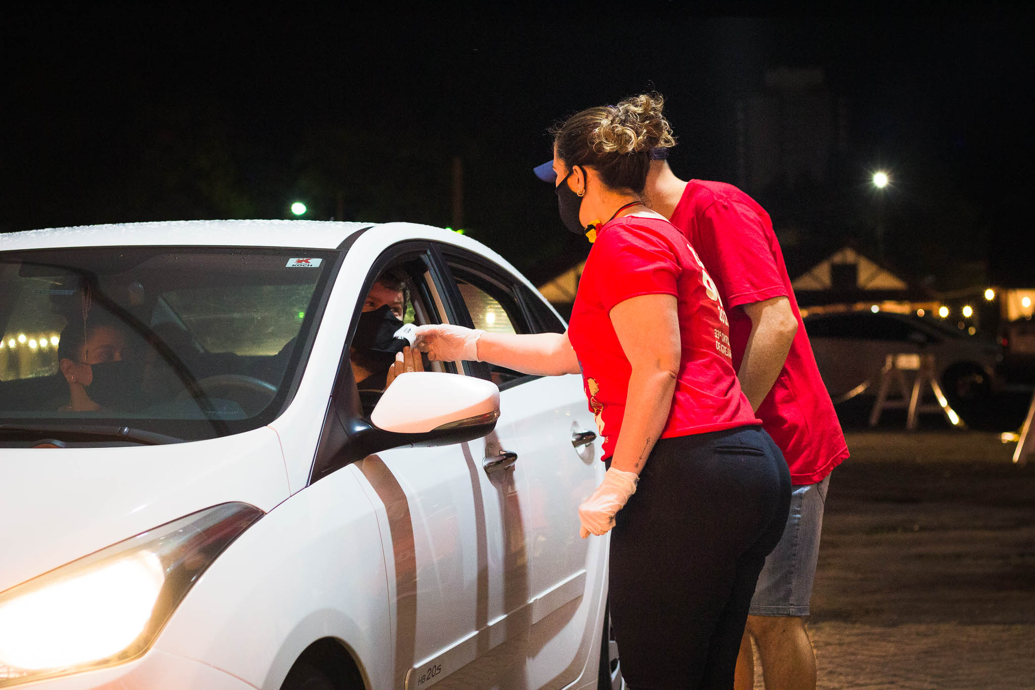 À noite, um dos momentos de maior emoção: a live da Oktober em Casa, com a Banda Brilha Som, relembrando os bailes da festa de outubro. Neste ano, a novidade foi a realização da transmissão ao vivo dentro do pavilhão dois do parque, símbolo dos grandes shows que ocorrem na Oktoberfest e local em que a própria Brilha Som é um dos destaques da programação. A interatividade com o público em casa foi comandada pela voluntária Natália Bischoff. “Me senti honrada em poder representar a maior festa comunitária do Brasil na live oficial, uma mistura de emoção e diversão”, comentou Natália, que interagiu com a banda, voluntários e até os visitantes do drive-thru.