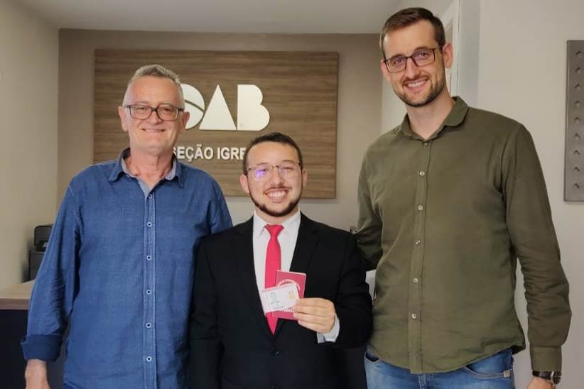 A conclusão do ensino superior merece muita comemoração! Para quem conclui o curso de Direito, a celebração se divide em duas partes: a formatura e a aprovação na OAB com a conquista da carteira profissional. Quem comemora estas conquistas é o agora advogado Eduardo Pereira da Silva! Na primeria foto ele sorri com a mana Carol, a mãe Mariazinha e o mano Fernando. Na segunda, aparece ladeado pelos colegas e amigos Clóvis e Tiago Werb.