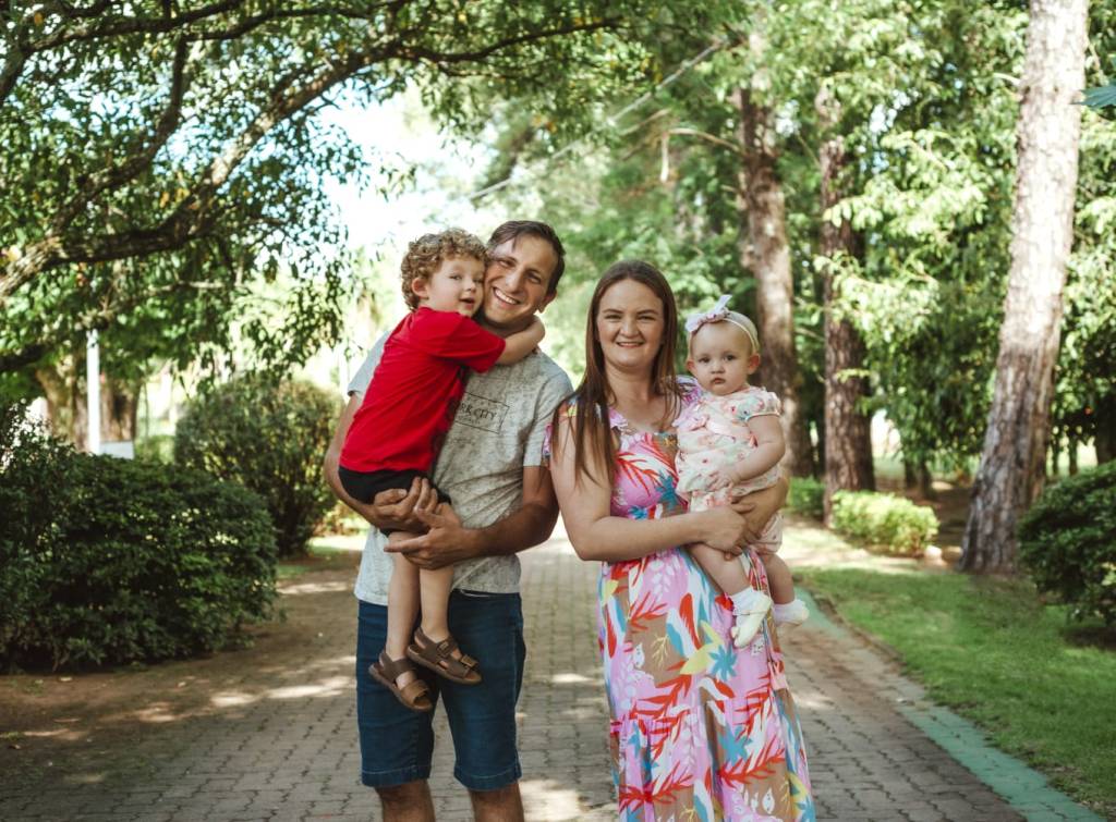O casal Roberto Linden e Gisa Schmitz (ao centro) celebra em 2021 a abertura da Schmitz & Müller Ferragens. No clique, em família agradecendo aqueles cujos sobrenomes dão nome ao estabelecimento comercial.