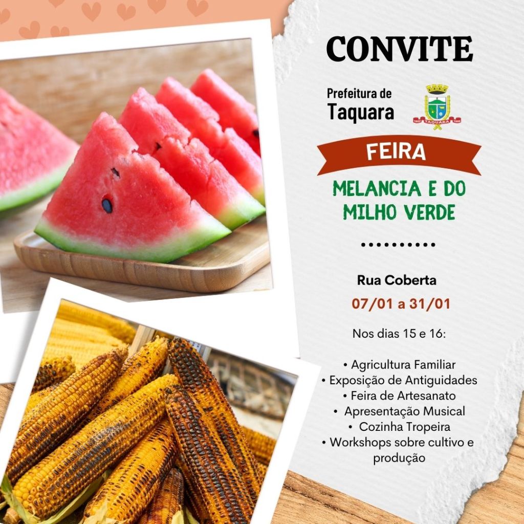 Durante o mês de janeiro, já é tradicional que a melância ganhe destaque em Taquara. Agora, a partir de 2022, o milho verde também ganha espaço. A partir desta sexta-feira, 7, até o final de janeiro, a Rua Coberta de Taquara, recebe o evento “Feira da Melancia e Sapecada do Milho”. Mesmo não havendo a comercialização de milho verde por causa da estiagem, haverá momentos para degustação de pratos com o cereal.
