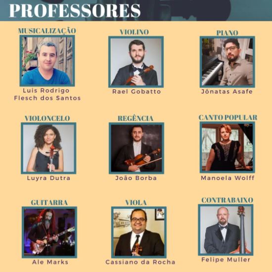 O time de professores conta com profissionais da músicas que são referência em suas áreas: Luis Rodrigo Flesch dos Santos (Musicalização), Rael Gobatto (Violino), Jônatas Asafe (Piano), Muyra Dutra (Violoncelo), João Borba (Regência), Manoela Wolff (Canto Popular), Ale Marks (Guitarra e contrabaixo elétrico), Cassiano da Rocha (Viola) e Felipe Muller (Contrabaixo).