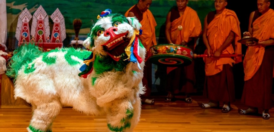 Outra apresentação será do Leão da Neve, um animal celestial e lendário do Tibet, que representa poder, coragem e destemor. Ele vive nas montanhas nevadas e é normalmente retratado como tendo o corpo branco, com a juba, cauda e algumas partes verde turquesa. Ele aparece com frequência em provérbios e músicas do folclore tibetano. Uma forma da dança é chamada Dança dos Leões da Neve ou Sengue Garcham, que pode ser grosseiramente traduzida como Dança da Alegria, bastante comum no Losar para atrair alegria e boa sorte para o novo ano. O figurino consiste em uma máscara de madeira, que está sendo esculpida e pintada a mão, com o corpo em tecido peludo. Cada Leão precisa de dois dançarinos, um para a parte da frente e um para a traseira do Leão. Uma performance muito alegre e descontraída que encanta adultos e crianças.