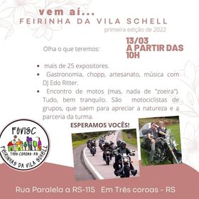 A Feirinha da Vila Schell, em Três Coroas, realiza a sua 12ª edição no próximo domingo, 13 de março, a partir das 10 horas. Criado em novembro de 2020 por moradores locais que são empreendedores com o intuito de fomentar as vendas, divulgar seus negócios e gerar vendas, o evento vem crescendo a cada edição. Fazem parte artesãos, pequenos comerciantes e pessoal de gastronomia, agora também vindos de outros bairros do município.