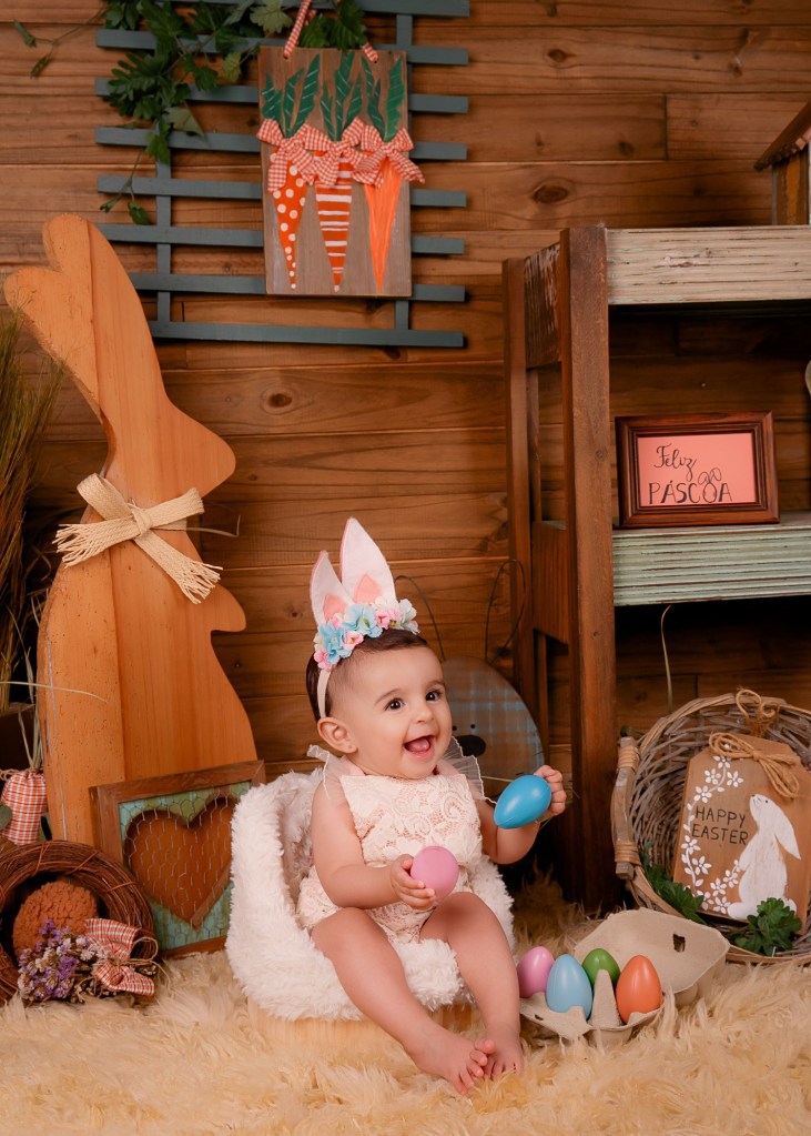 Muita cor e alegria no ensaio de 9 meses do Tobias Miguel, temático da Páscoa. Foto: Müller Foto e Vídeo