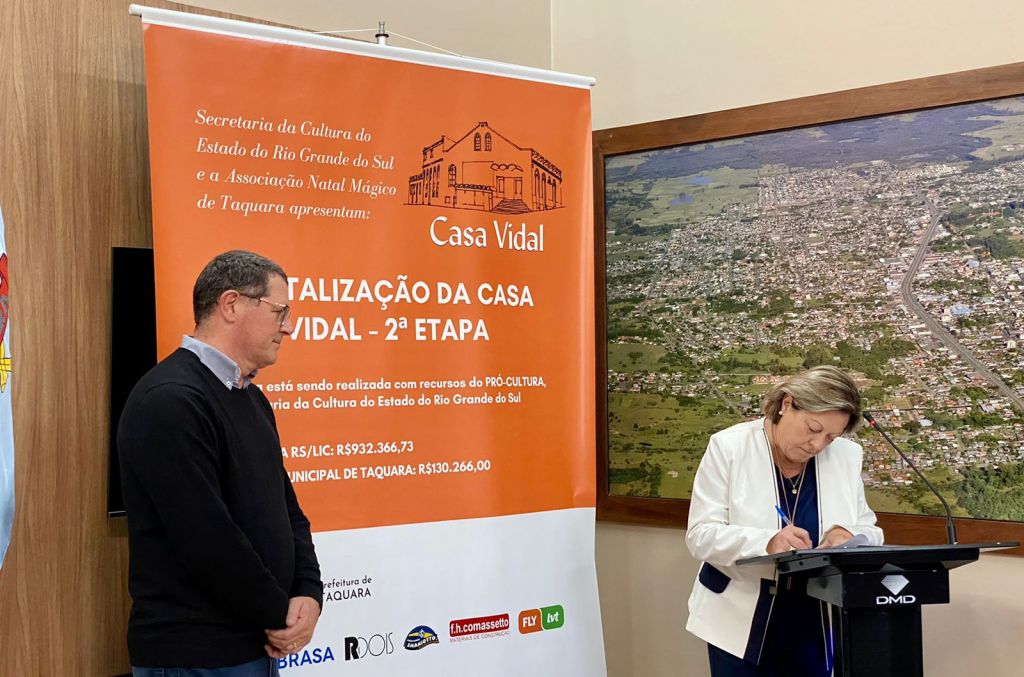 A segunda etapa do projeto de Revitalização da Casa Vidal foi lançado oficialmente na tarde dessa sexta-feira (27). Com financiamento por meio da Lei de Incentivo à Cultura (LIC) de R$ 932 mil, o projeto dá continuidade nas ações de melhoria do patrimônio histórico do município de Taquara. O ato de início da nova etapa contou com a participação da secretária da Cultura do Rio Grande do Sul, Beatriz Araujo. O projeto da Casa Vidal teve em sua primeira fase a obra de restauro da edificação concluída em novembro de 2020, com a prestação de contas homologada no dia 4 de novembro de 2021. Erguida na segunda metade do século 19, a Casa Vidal foi o segundo prédio em alvenaria construído em Taquara. Atualmente, é o mais antigo ainda em pé na cidade. Em agosto de 2012, a edificação foi declarada Patrimônio Municipal tombado.