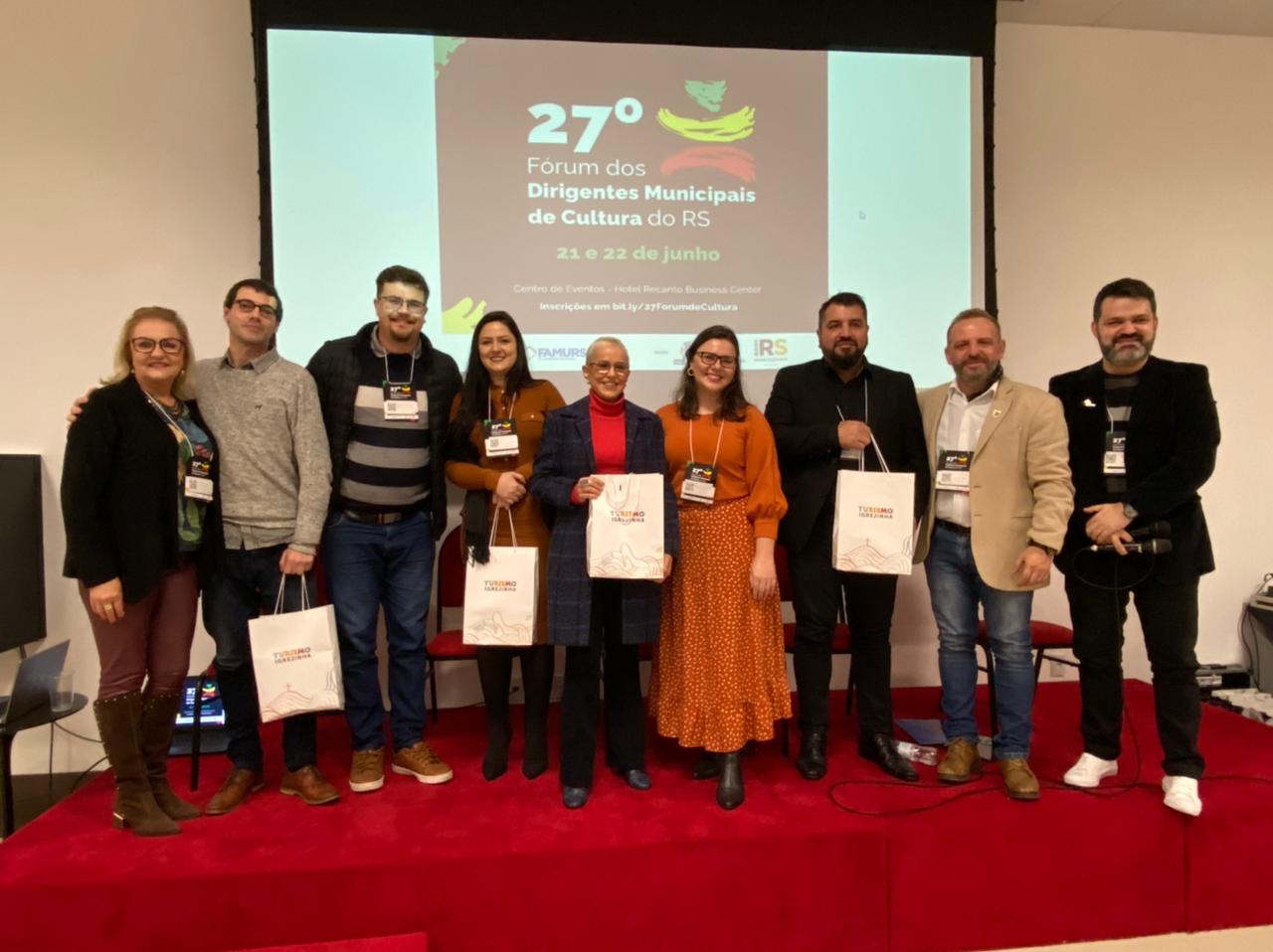 A coordenadora de cultura de Três Coroas, Carine Setti, o coordenador de cultura de Igrejinha, Maxwel de Matos, e o secretário de Turismo e Cultura de Igrejinha e também vice-presidente do Conselho dos Dirigentes Municipais de Cultura do RS (Codic Famurs), Juliano Müller, participaram do 27° Fórum Estadual dos Dirigentes Municipais de Cultura, promovido pelo Codic Famurs, no município de Restinga Seca. O evento contou com a participação de secretários, diretores e coordenadores de diversas regiões do Estado, que acompanharam relatos com experiências de profissionais como a secretária municipal de cultura da capital paulista, Aline Torres; da consultora da Municipa, Ana Clarissa Fernandes; do diretor do Museu Nacional Soares dos Reis, da cidade do Porto, Portugal, Antonio de Ponte.